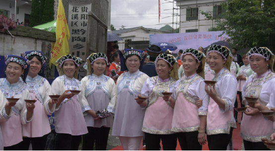 布依族青年們抬著族中神物銅鼓,吹著長(zhǎng)長(zhǎng)的號(hào)角,臉上滿是對(duì)民族節(jié)日的期待之情,驕傲又興奮;成群結(jié)隊(duì)的孩童穿著本民族傳統(tǒng)服飾,手拿錦帶,熱忱歡迎遠(yuǎn)道而來的客人;能歌善舞的布依阿姐笑臉相迎,唱著布依族的歌謠,一字排開堵在門前,客人們想要進(jìn)去參加這次盛會(huì),就得過三關(guān),干了三碗攔路酒。
