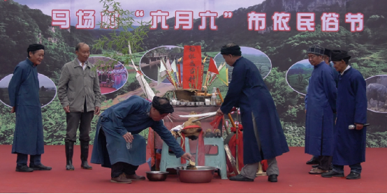 祭祀活動(dòng)由寨老主持。牛頭、活雞等祭品供于案前,寨老穿著布依族的藍(lán)袍,誦頌著古老神秘的經(jīng)文,黝黑的臉上寫滿了對(duì)祖先、神靈的虔誠(chéng)。而其他幾位德高望重的寨中老人,這時(shí)便協(xié)力殺了雞,人們用雞血淋紙旗插于火盆中,以火盆代替稻田,意為雄雞吃盡蝗蟲,糧食豐收,馬馱不盡。