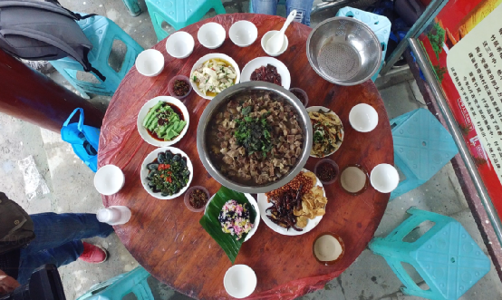 喝罷三碗阿姐手中的米酒,這滿桌的美食就等著動(dòng)箸了。長(zhǎng)桌宴席的主菜,即是為了“六月六”祭祀而宰的牛。那一大盆牛肉堆積如山,面上灑滿薄荷,清香四溢,味美量足,一桌人都吃不完。一方面足見布依人民的豪爽,另一方面也許是為了大家相聚的時(shí)間更多,在餐桌上把酒言歡。