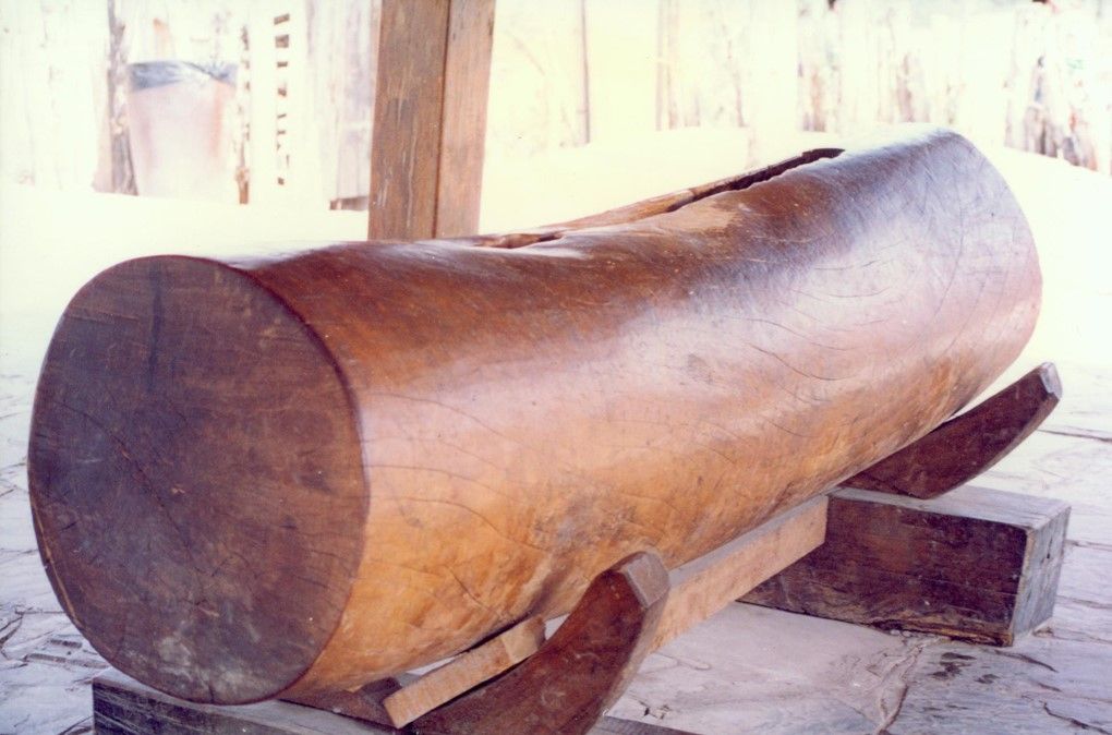 過去,佤族凡新建一個(gè)村寨,就要先找水源定寨址,再拉木鼓蓋木鼓房。佤族認(rèn)為木鼓是天神莫偉的床,木鼓房是莫偉的家,只有拉了木鼓,請(qǐng)莫偉天神進(jìn)寨保佑、才能建房立寨,拉木鼓的日子一般在佤歷一月,即公歷10月進(jìn)行。是時(shí),先由寨子派出有經(jīng)驗(yàn)的老人3—5人進(jìn)山選擇樹木,將選定的樹木每棵劈一點(diǎn)樹皮回來,由魔巴殺雞卜卦,哪棵的卦好就確定為做木鼓的樹,而后由魔巴率領(lǐng)青壯年男子進(jìn)山將樹砍倒,斷出一截做木鼓用。全寨男女老少盛裝艷服將木頭拉回,鑿成木鼓,安放于鼓房?jī)?nèi)。拉木鼓的場(chǎng)面極為熱鬧壯觀,人們以能摸一下拉木鼓的繩索為最大的榮耀。木頭拉到寨外要舉行隆重的剽牛祭神儀式才能將木頭拉進(jìn)寨內(nèi)。木鼓有公母之分,公木鼓用紅毛樹,母木鼓用麻公樹。鼓長(zhǎng)1.5-2米,鼓身直徑70—100厘米,一般是扁形和方形。洞深40-50厘米,洞口寬4-5厘米,長(zhǎng)1.2-1.4米。洞呈瓜瓢形。背端多有牛頭形浮雕。由于所用本質(zhì)不同,公木鼓發(fā)音高亢清亮,母木鼓沉渾悠揚(yáng),響聲遙遠(yuǎn)。過去,只有逢村寨大事或械斗或集會(huì)議事,或祭祀鬼神,或告急友鄰才能敲響木鼓,平時(shí)是不能隨便敲的。由于佤族歷史上有獵人頭祭祀木鼓的習(xí)俗,村寨部落間經(jīng)常發(fā)生血族復(fù)仇的械斗。隨著獵頭陋習(xí)的革除,木鼓已從原始祟拜的氛圍中擺脫出來,成了人們喜愛的敲擊樂器,佤族編創(chuàng)了自?shī)首詷返哪竟奈琛?/p>