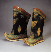 蒙古人愛(ài)穿靴子,蒙古靴分布靴和皮靴兩種。布靴多用厚布或帆布制成,穿起來(lái)柔軟、輕便。皮靴多用牛皮、馬皮或驢皮制成,結(jié)實(shí)耐用,防水抗寒性能好。其式樣大體分靴尖上卷、半卷和平底不卷的三種,分別適宜在沙漠、干旱草原和濕潤(rùn)草原上行走。蒙古靴做工精細(xì)考究,靴幫、靴靿上多繡制或剪貼有精美的花紋圖案。