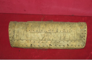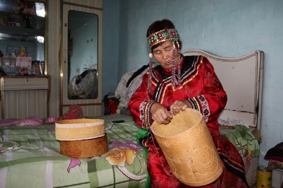 鄂倫春族素有“白樺民族”之稱,白樺樹皮制品種類非常多,大到可以乘人載物的樺皮船、圍蓋“仙人柱”的“鐵克沙”,小到可以裝在衣兜里的煙盒和含在口中的狍哨,提水用的桶、采集用的簍、裝物用的箱、盛飯用的盆、吃飯用的碗、喝酒用的蠱等等。樺樹皮制品的裝飾圖案可以通過壓劃、壓印(點(diǎn)刺)、剔刻、烙燙、補(bǔ)花、繪畫等多種方法形成。壓印點(diǎn)刺是最常用的裝飾手段,工具是用獸骨制成的,分單齒、雙齒、多齒和簡(jiǎn)單幾何形幾種。先在剪裁好的器物材料上,用壓、打等方法點(diǎn)刺出裝飾紋樣,再縫合成器物成品。這種裝飾多為素面凹形花紋,顯得樸實(shí)單純,而且器物越陳舊樺皮顏色越深,越有光澤,圖紋越清晰。也有人在壓打線上著色,這便形成了另一種風(fēng)格,美觀艷麗而且突出了物象特征。
