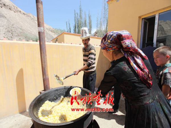 由于我們是遠(yuǎn)道而來(lái)的客人,女方家邀請(qǐng)我們進(jìn)屋品嘗抓飯、牦牛肉。我們了解到,新婚夫婦是一個(gè)村的,他們?cè)诟=ㄈ荽蚬r(shí)彼此相識(shí)。今天是婚禮的第二天,真正的柯?tīng)柨俗巫寤槎Y要辦整整三天呢!