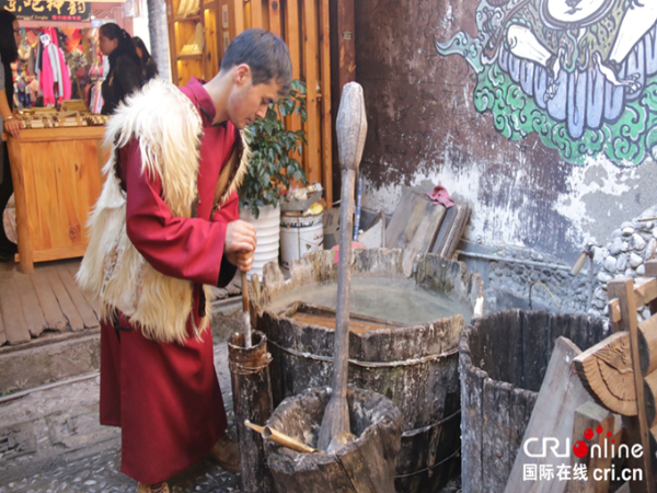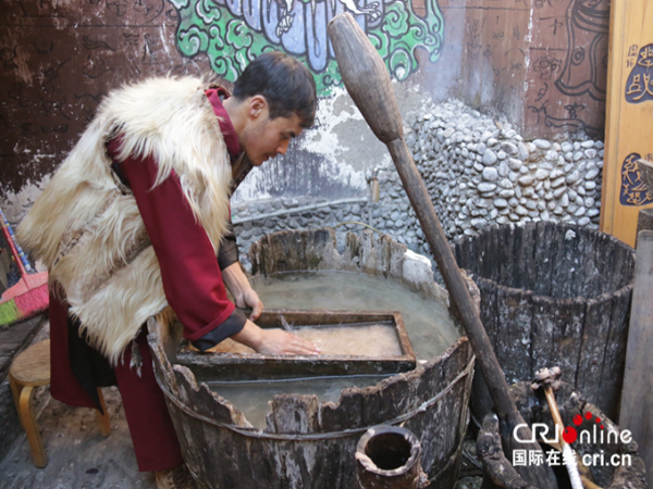 納西族男子楊慧杰展示東巴紙的造紙過(guò)程