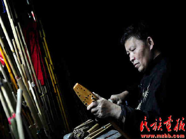 莫師傅在對兩個蘆笙進行高低音的和諧調(diào)試
