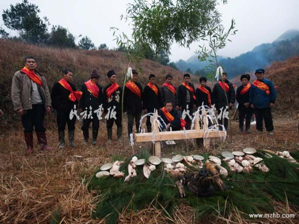 到招龍儀式活動點(diǎn)時(shí),已是凌晨五點(diǎn)半,我們所在的位置是一個(gè)山腰,有一個(gè)小壩子。我發(fā)現(xiàn)參加儀式的只有十二三個(gè)人,就好奇地問:“為什么只來十多個(gè)人?”原來這些人是選出來的代表,該村有7個(gè)村民小組,共203戶,有980多人口,每次招龍大喜時(shí),要從村民中推選出12位作為招龍代表,從頭到尾主持一切事務(wù)。說話間,村里人就開始忙著生火,或準(zhǔn)備各項(xiàng)招龍工作。他們用木板支起一個(gè)擺放祭品的臺板,擺上祭品。接著,在招龍師傅的主持下,儀式正式開始。第一個(gè)程序是“喊白虎龍”,苗家稱為“共階夸羊捌”,師傅拿著一個(gè)白公雞,進(jìn)行一番念誦后宰殺掉,等雞煮熟后再擺上祭臺。