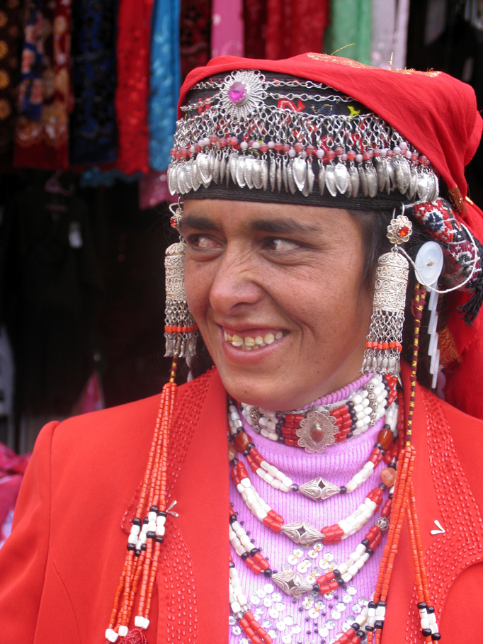 塔吉克族婦女服飾的顏色艷麗而奪目,大多數(shù)會以紅色為主,她們喜歡穿連衣裙,并在裙邊、領口、袖口上繡以美麗的花紋或者圖案,還喜歡用耳環(huán)、項鏈、手鐲等首飾來裝扮自己。她們十分講究頭飾和帽子,有一種青年婦女的圓形花帽上會嵌鑲金、銀片和各種珠子,帽子前沿會裝飾一排色彩鮮麗的珠子、銀鏈。婦女著裝時帽沿上會加綴一排小銀鏈,在塔吉克語中稱為“斯拉斯拉”,戴著大耳環(huán),脖子山會繞數(shù)道項鏈,胸前還會佩戴被稱為“阿勒卡”的圓形大頭飾。通常情況下,已婚婦女會在發(fā)辮上綴飾白紐扣,新娘也會在發(fā)辮上飾以絲穗,以求美觀。在塔什庫爾干,打扮得花枝招展的塔吉克婦女隨處可見,猶如從天上云彩中下凡的仙女。塔吉克族已婚婦女的裝束也十分吸人眼球,她們外出時,會在帽子外披上頭巾,迎風走來,頭巾隨風飄揚,別有一番風度。