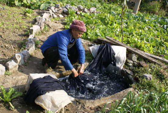 從前壯族鄉(xiāng)村,普遍掌握制作藍靛及印染方法。一般置一大缸,將藍草放入浸泡,加石灰使之分解、發(fā)酵,經(jīng)過化學變化,而后濾去殘渣,蒸發(fā)水分,凝成糊狀藍色染料。其間需不斷攪動,使色素充分化解。“每靛草六百斤,造成一百斤之靛為佳?!币虍a(chǎn)量較多,遠銷廣東。浸染時,將適量靛糊化于染缸中,同時將雞血藤搗碎加入。布要反復浸泡多次,晾泡結合,直到染為深藍色。其間雞血藤釋放出一種紫紅色的植物膠,將藍靛色素粘在纖維上,是色素耐水耐腐耐紫外線,不易褪色,并有若隱若現(xiàn)的亮點,結實美觀。這個過程,運用了化學分解法。
