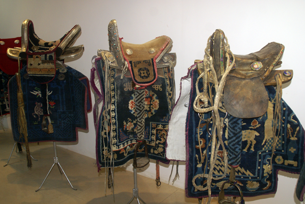 裝飾弓、矛、劍、盾、箭筒,尤其馬鞍,是蒙古族牧民的一貫愛(ài)好。大汗的坐椅是包金的,龍頭虎狀,鞍馬帶上亦以黃金盤(pán)龍為飾。鞍鞒喜歡配有各種裝飾,有的繪制圖案,有的用骨雕鑲嵌,有的鑲嵌金屬工藝制品。蒙古人更喜歡銅壺、銀碗、金杯等飲食器具。