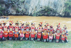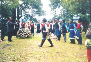 活動的最后一套儀式,便是送藥和摸荷包。所謂送藥,即人們把自己認為最好的藥草,用紅頭繩拴捆成束,唱著祝福歌相互贈送。摸荷包即把各人的雙眼用手帕遮住,讓他(她)唱著《許愿歌》,去摸取一個系在活動場地四周那些插著的花枝上的荷包。據(jù)說,摸到荷包,就表示能夠得到藥仙的佑護,終生不會生病。