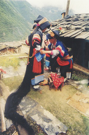 用純黑牛毛線續(xù)接編成的300余根辮子,長達4米,猶如黑色的瀑布