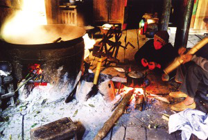 二層為生活起居場所。壯家人的火塘,是一家人炊煮就餐、烤火取暖之處。現(xiàn)在即使用上了沼氣和電器的家庭也離不開火塘