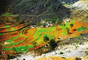 廣西百色地區(qū)那坡縣村落。村寨多隨地形與山勢,布局自由分散,既不存在縱橫軸線,也沒有明顯的村寨邊界。受地形影響,村寨規(guī)模一般不大