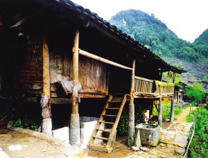 為適應濕瘴環(huán)境,吊腳樓房屋兩層的較多,下層圈養(yǎng)家畜,堆放雜物,二層為居住生活層。前檐的4根立柱用圓柱形礎石支墊,這種石木結合,既古樸又穩(wěn)重。在廣西百色地區(qū)的那坡縣,世居著以黑為美的壯家人,因大山深處交通閉塞,至今傳統(tǒng)文化濃郁,成為廣西壯族自治區(qū)研究壯族文化的基地之一。