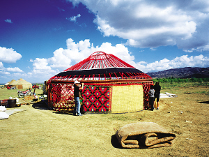 氈房外觀通常樸實(shí)無(wú)華,門(mén)框由松木做成,上面雕刻花紋或繪制圖案,一塊鮮艷奪目的掛毯吊在門(mén)上。房?jī)?nèi)富麗堂皇,布置合理,前半部分堆放日用物品,后半部分待客、住人。