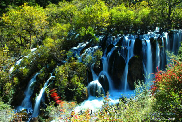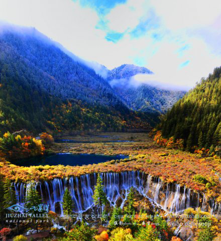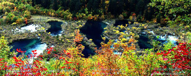九寨溝四周群山聳峙,有雪峰數十座,高插云霄,終年白雪皚皚。河谷地帶奇水薈萃,其間有成梯形分布的大小湖泊114個,瀑布群17個,鈣華灘流5處,泉水47眼,湍流11段,以1870米的海撥高差,在12 座雪峰之間穿林跨谷,珠連玉接,呈Y字型串珠,逶迤近60公里,形成了中國唯一、世界罕見的以高山湖泊群和瀑布群以及鈣華灘流為主體的風景名勝區(qū)。湖泊小者數平方米,最大的長海長達7公里。湖水終年碧藍澄澈,色彩斑讕,在陽光照射下,呈現(xiàn)出藍、黃、橙、綠等多種色彩,絢麗奪目。天氣晴朗時,藍天、白云、雪山、森林倒映湖中,水光浮翠,美麗如畫,并隨季節(jié)推移呈現(xiàn)出不同的色彩和風韻,有“九寨歸來不看水”之說。