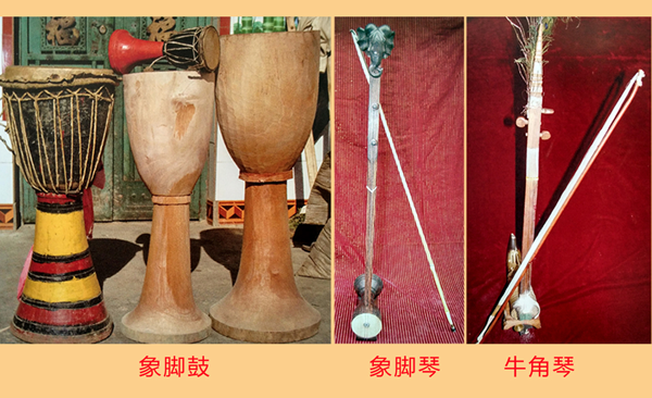 傣劇是在傣族民間歌曲和歌舞音樂的基礎(chǔ)上發(fā)展起來的,并借鑒了漢族戲曲藝術(shù)的表現(xiàn)手段,流傳于德宏、保山、臨滄等傣族聚居區(qū)。傣劇包括多種男女唱腔,男腔多用羽調(diào)式,女腔多用徵調(diào)式。20世紀(jì)50年代以來,傣劇吸收了多種傣族民歌和舞曲,豐富了唱腔,增強了音樂的表現(xiàn)力。傣劇唱腔基本是上下句組成的樂段及其變化反復(fù)。由于唱詞字?jǐn)?shù)可多可少,因此唱腔樂句長短不一。過去,傣劇只用小堂鼓、鑼、镲等伴奏,后逐步采用了多種民族樂器及西洋管弦樂器,組成新型的傣劇樂隊。傣族的民族樂器屬于吹奏樂器的有篳、葫蘆簫(如圖)、豎笛、木葉等;彈撥樂器有玎琴、口弦等;弓弦樂器有西玎(玎琴)、牛角玎(牛角琴)等;打擊樂器有象腳鼓、光隆、光邊、光邦、鑼、镲等。象腳鼓、鑼、镲的合奏是傣族器樂合奏的主要形式。
