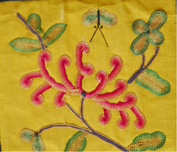 1.平針繡,又稱“直針”,是滿族枕頂刺繡最基本的針法之一,它能準確地表達植物花卉、動物禽獸、人物、器物等。在所有針法中,平針是分布最廣、使用范圍最大的針法。它的運針方式是起針、落針都在圖案的輪廓邊緣,針腳排列均勻,線跡平行,不重疊交錯,紋樣之間的線條靠空出地面來表現(xiàn)。
