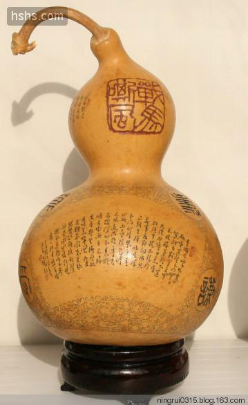 葫蘆雕集繪畫、書法、篆刻藝術(shù)于一體,傳承和發(fā)展了我國傳統(tǒng)“葫蘆文化”。甘肅的雕刻葫蘆最早出產(chǎn)于蘭州,距今約100多年,據(jù)說早期的蘭州雕刻葫蘆比較簡單,對葫蘆不會(huì)做刮皮、磨光等加工處理,也不填色;只是在葫蘆表皮雕刻出山水、風(fēng)景或戲劇人物,作為兒童的玩具,在街頭巷尾出售。到了清代光緒年間,秀才蘭州人李文齋對葫蘆雕刻工藝做了改進(jìn)。他針對當(dāng)時(shí)雕刻表面粗糙、題材單調(diào)的弊端,首先將葫蘆原生表皮刮去、磨光,并用鏹水混合燃料,染成紅黃二色,是雕刻的景物不易脫落;其次,擴(kuò)大圖案創(chuàng)作題材,在原有山水、花草等圖案基礎(chǔ)上,增加了如《桃花源記》、《蘭亭集序》、《竹林七賢》等歷史文化和神話故事,形成了圖文并茂的題材格局;最后是在雕刻工具上采用了以針代刀,使圖案形象更加情景交融,栩栩如生。其雕刻葫蘆的特點(diǎn)主要是求其意態(tài)之美,追求神似;人物寥寥數(shù)筆,山水花卉濃淡相宜,形神兼具,求其風(fēng)雅;題款文字、細(xì)如蚊足,點(diǎn)綴成行,瀟灑自如。