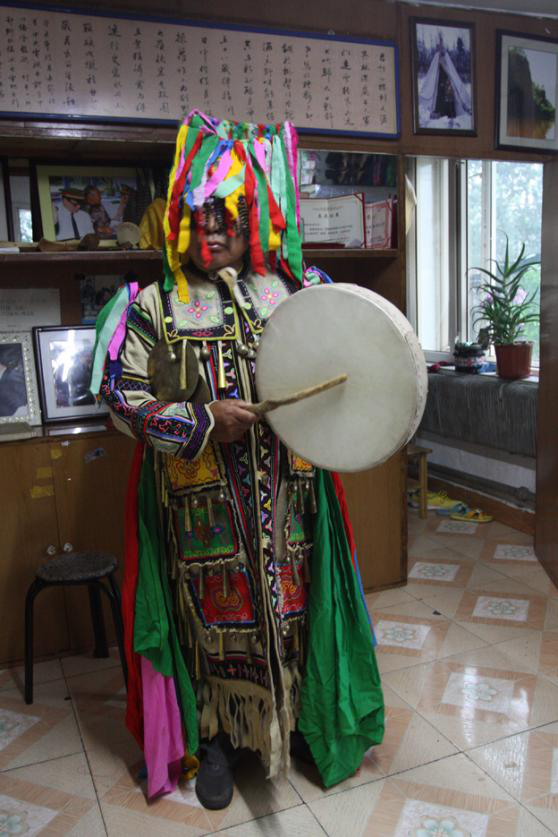 冬天穿的鞋是“奇哈密”和“溫得”,“奇哈密”是用狍脖皮或犴皮做靴底,用狍腿皮拼縫成靿的短靴?!皽氐谩笔怯寐够蜥砥ぷ龅祝够蜥硗绕て纯p成靿的長靴?!皽氐谩币?yàn)殪壐?,冬天穿著打獵不易灌雪。這兩種靴子都要用冬季絨毛狍皮做成的襪子配套穿用,暖和跟腳,踩在雪地上沒有聲響。夏天一般穿“奧勞其”,是一種皮底布靿短靴。“考呼落”,是用冬季絨毛狍皮縫制的二指手套,掌面腕部留一縫口,手從縫口中伸出,手套仍護(hù)在手背上,既使在零下40度的嚴(yán)寒中處理獵物,也不用擔(dān)心手被凍壞。還有一種五指狍皮手套,背面正中繡花、蝶等中心圖案,五指的關(guān)節(jié)和指甲處繡出各種小型圖案,然后用連理枝將中心圖案和關(guān)節(jié)、指甲圖案連為一體,中心圖案代表手掌,手指圖案代表關(guān)節(jié)和指甲,連理枝代表骨骼和血脈(圖為越來越鮮見的薩滿服飾,吳雅芝供圖)。