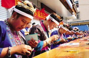 三江縣同樂(lè)苗族鄉(xiāng)舉辦刺繡手工限時(shí)賽,繡娘們向游客們展示傳統(tǒng)的少數(shù)民族刺繡技藝