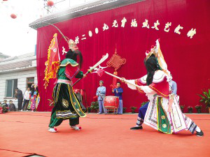 在花溪區(qū)的地戲中,最有影響力的是大寨地戲隊,除天時地利人和外,他們的演出技巧高于其他戲班,湖潮新民、黨武下壩和燕樓思惹三個地戲隊次之,其他隊則各有所長,他們的演出同樣受到當?shù)厝说臍g迎?;ㄏ獏^(qū)的地戲演唱,只用一面大鼓和一只銅鑼打節(jié)奏即可。布依族地戲充滿陽剛之氣,雖然地戲的唱詞本地人也很難聽懂,但只有在那山那鄉(xiāng)才能有那樣的體驗,讓你頓生一種鄉(xiāng)土的莊重的歷史感。