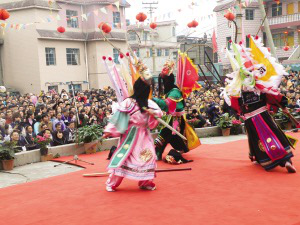在貴陽花溪,地戲可不止大寨一撥。花溪區(qū)的地戲共有18撥,也就是各個村寨的地戲隊:花溪大寨、燕樓的思惹、槐州、燕樓村(燕樓村有兩撥)、谷蒙、黨武的當陽、葵林村、新寨、下壩、湖潮的新民、楊梅、寅貢、車田、蘆官、汪官、元方和麥坪的杉木二村。這些地戲隊所演出的劇目都是《薛仁貴征東》、《楊家將》、《羅通掃白》、《三國演義》、《岳飛傳》等歷史故事劇,表演場地方便人們觀看。演者均戴面具,服飾簡單,以鼓擊節(jié)而歌,一人領唱,眾人合之,不用其它樂器伴奏,其風貌近似陽腔。