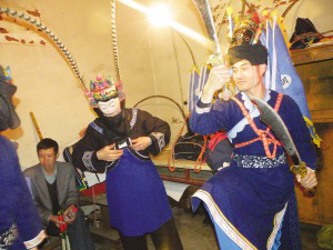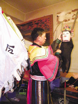 請“臉子”是地戲表演時一個非常講究的開場儀式?!巴捅さ貞颉钡恼埬樧觾x式通常是整個戲班子的人都必須參加祭拜。表演時必須鄭重地從箱子里請出珍藏的“臉子”,“臉子”才具有神的靈性??墒俏覀兛吹降拇笳家赖貞?,在保持傳統(tǒng)的同時又不失自己的個性。通常請“臉子”是由當?shù)亻L老一個人完成所有的祭拜過程,一切都是那么簡單。祭拜中都是用當?shù)氐牟家涝掓告傅纴?,這樣的表演給它增添了別有的韻味。