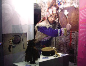 在民族文化宮的展覽中,有一幅大照片——一位老釋比,手拿羊皮鼓,頭戴猴皮帽,表情莊嚴(yán)、凝重。那正是釋比傳人朱金龍。朱金龍這次也來(lái)到了北京,把他祖祖輩輩傳下來(lái)的釋比文化展現(xiàn)給北京的觀眾。