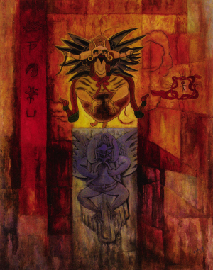 我以前所結(jié)識的一批納西族畫家差不多都是上世紀(jì)四五十年代出生的,他們大多接受過美院等高等藝術(shù)院校的教育,具有堅實的繪畫功力,有相同的美學(xué)見解和共同的探索形成的藝術(shù)追求。它一出現(xiàn)就以其獨特的美學(xué)傾向和特殊的藝術(shù)魅力引起世人的關(guān)注。而和向東是上世紀(jì)70年代出生的青年畫家,他原來就讀于浙江大學(xué)的藝術(shù)設(shè)計專業(yè),只因迷上美術(shù)學(xué)理論而走上了創(chuàng)作之路,沒有學(xué)院派的背景。他的家鄉(xiāng)云南麗江現(xiàn)在已是聲名鵲起,納西族東巴文化作為世界記憶遺產(chǎn)已聞名海內(nèi)外。作為年輕一代的納西族畫家又該怎么表現(xiàn)東巴文化呢?這個學(xué)藝術(shù)設(shè)計的年輕人以設(shè)計師的獨特眼光和思維,一開始就與“現(xiàn)代東巴繪畫派”的中年畫家群體拉開了距離。其作品在保留古老的東巴繪畫藝術(shù)的基礎(chǔ)上,在作品中運用書寫東巴經(jīng)卷的各種形象和文字符號。用當(dāng)代人的思維觀念和審美意識,運用油畫的技法來表達(dá)。畫面大多用平面設(shè)計的構(gòu)成原理,以裝飾性的、形式感極強的、既寫實又抽象的手法表現(xiàn)出原汁原味的納西文化。即使拋開作品主題內(nèi)涵,依然可以從他的作品里感受到一種神秘、古樸、深沉的歷史基調(diào)。因4年前他的創(chuàng)作是在平面設(shè)計為主的業(yè)余時間里完成的,而真正投入精力進(jìn)行專業(yè)創(chuàng)作是近兩年的事,因此,他現(xiàn)在處于學(xué)習(xí)、吸收、探索創(chuàng)作的過程中。