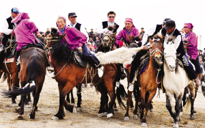 2014年5月2日,新疆克拉瑪依市在烏爾禾鄉(xiāng)舉辦了第三屆少數(shù)民族傳統(tǒng)體育運(yùn)動(dòng)會(huì)。在開幕式上,數(shù)萬名各族市民和農(nóng)牧民觀看了克拉瑪依市千余名各族退休職工表演的大型健身操。300余名來自維吾爾族、哈薩克族、蒙古族等民族的運(yùn)動(dòng)員,參加了賽馬、叼羊、姑娘追、摔跤等活動(dòng)。圖為叼羊比賽現(xiàn)場。