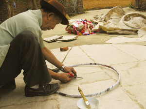 言談間,巖妞把制好的竹環(huán)放入早已畫好的同心圓圖案中的小圓上,只見竹環(huán)大小正好與小圓吻合。巖妞說,圖案外側(cè)的大圓便是擺放棉紙用的。接著,他把手中厚厚的幾張棉紙圍繞著已經(jīng)放入圖案中的竹環(huán)依次擺入,直至擺滿。在同心圓圖案的上側(cè),巖妞還畫了一個寬與同心圓圖案的直徑相符的矩形圖案,把棉紙鋪滿其中。巖妞說,這圖形就是“貢菲”的高度。制作的最后一道程序,是把棉紙用漿糊粘合起來。陰干后,一個“貢菲”就做好了。