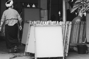 澆紙是在紙槽中進(jìn)行的,不但需要強(qiáng)勁的臂力,還需要相當(dāng)?shù)募?xì)心。在紙槽中舀水的時(shí)候,雙臂承受的重量不下10公斤,紙要澆得恰到好處,澆輕了紙就太薄,澆重了紙又太厚。太薄出不了好品相,太厚會增加成本。這是整個構(gòu)紙成品的關(guān)鍵,經(jīng)驗(yàn)老到的傣族老人,都不會在這道工序上馬虎。一雙手游走在澆紙槽,或輕輕拍打,或慢慢游弋,絮狀的纖維時(shí)而附著在手上,時(shí)而又歡呼雀躍地散開,頑皮得有點(diǎn)像芒團(tuán)村水塘邊遇上的那些孩子。憑感覺均勻了,老人這才輕輕將澆紙盤脫離水面,一眨眼功夫,一張構(gòu)紙便在盤上現(xiàn)出端倪。接下來的事就交給陽光了,如果雨季來臨,構(gòu)紙就停止生產(chǎn)。所以說,芒團(tuán)構(gòu)紙常常浸漬著一種陽光的味道。