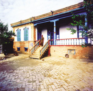 維吾爾族的傳統(tǒng)民居以土坯建筑為主,多為帶有地下室的單層或雙層拱式平頂,農(nóng)家還用土胚塊砌成晾制葡萄干的鏤空花墻的晾房。住宅一般分前后院,后院是飼養(yǎng)牲畜和積肥的場地,前院為生活起居的主要空間,院中引進(jìn)渠水,栽植葡萄和杏等果木,院內(nèi)有用土塊砌成的拱式小梯通至屋頂,梯下可存物,空間很緊湊。