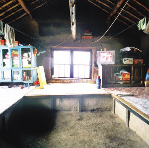 達斡爾族住房以兩間或三間居多,以西屋為上,不設北窗。東西兩屋的南面各有3扇窗戶,中間一間在房門兩側(cè)各有一扇窗戶,西屋開兩扇西窗,更利于采光和通風,這在北方民居中比較少見。兩間房的西屋是起居室,南、西、北三面連炕,成“凹”字形,與滿族的“萬字炕”差不多。近些年,達斡爾族家庭人口少了,特別是結(jié)婚的新房只搭北炕,南面放置組合家具和冰箱、洗衣機。東屋開南門,作為廚房,砌鍋灶,一般用8印或10印的鐵鍋。煙囪在墻外,與房頂有距離,有的用草垡子壘砌,有的用木板,這樣的煙囪不僅抽力大,灶堂好燒,而且可以避免草房頂?shù)幕馂?。近十幾年建的房子,煙囪都在西山墻上用磚壘砌,一直伸出屋脊后坡,高出房頂一米多。
