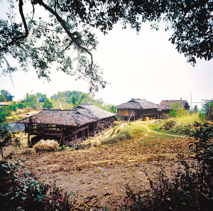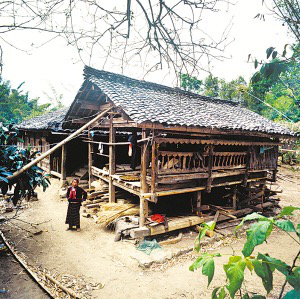 云南省潞西市三臺山鄉(xiāng)的德昂族居住分散,村寨很小,大都建在高半山上,山路行車?yán)щy。傳統(tǒng)住房為正方形干欄式竹木建筑,房屋兩層,為木柱結(jié)構(gòu)框架,竹篾編片圍墻,粗竹劈壓成自然的竹片做樓板,屋頂苫草排,當(dāng)?shù)厮追Q“草帽頂房。”