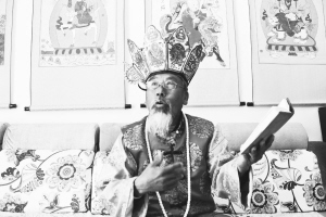 “東巴,在納西語里意為活佛或智者。”在玉龍納西族自治縣圖書館,李瑞山一邊講解,一邊向筆者展示館藏文物,這其中包括占卜紙牌畫、祭祀法杖和東巴經(jīng)等。引起筆者注意的是一幅形似唐卡的卷軸畫,畫中的主人公竟是藏族詩人倉央嘉措?!坝脰|巴文所寫的《卓伯所》一書里,記載了納西族與藏族、白族先民之間同宗共祖的兄弟關(guān)系,這點與木氏宗譜碑上所刻是一致的。所以,我們有關(guān)于藏族的記載并不奇怪,民族交融自古就有?!?/p>