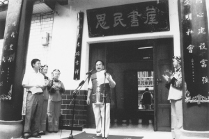 ?。}圖為王思明(中)在“思民書屋”落成儀式現(xiàn)場。資料圖片)