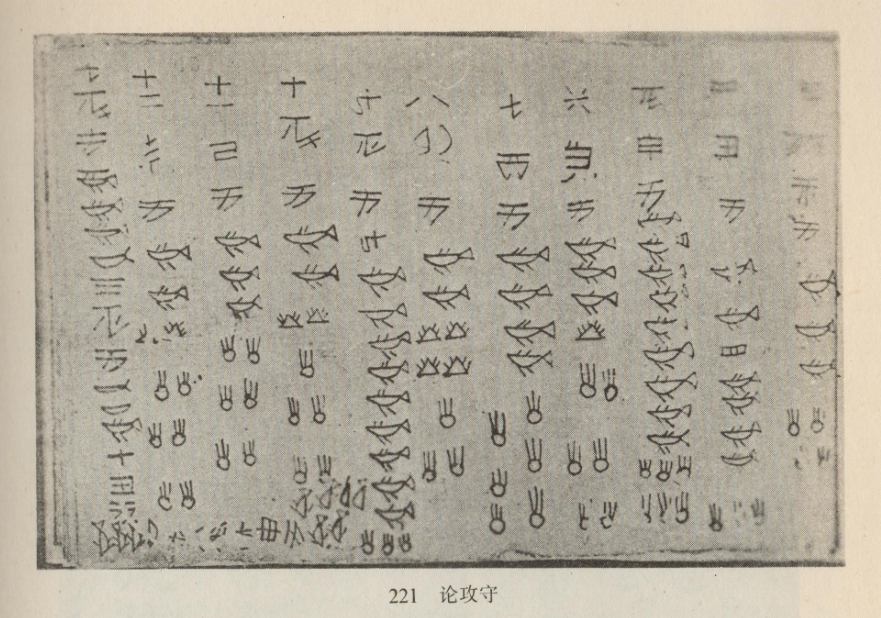 水書(shū)抄本。寫于清嘉慶年間,共20頁(yè),長(zhǎng)18厘米,寬27厘米。以竹簽作筆蘸墨書(shū)寫。內(nèi)容述戰(zhàn)爭(zhēng)陣法。中圖魚(yú)形表示守方,方框?yàn)橹笓]位置,三角形表示山頭陣地,圓圈加三畫(huà)表示進(jìn)攻之?dāng)硵⊥诵蜗?。原件存北京圖書(shū)館。