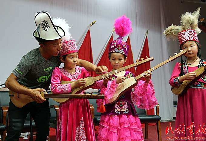 沙力哈爾別克·玉山巴依利用暑假教孩子們彈庫(kù)姆孜