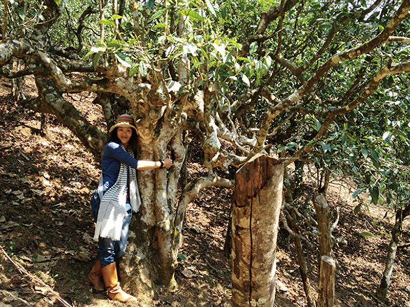 又走了一段,老茶樹開始出現(xiàn)在路邊。老茶樹主干與人的大腿等粗,萍芳家70年茶園茶樹主干也就手臂粗,長成大腿粗恐怕要好幾百年吧?茶樹上還另架著一根木頭以供上樹,我與唐郎興奮地爬上去假裝采茶,環(huán)顧四周滿滿的枝葉,原來站在古茶樹上這么威風??!