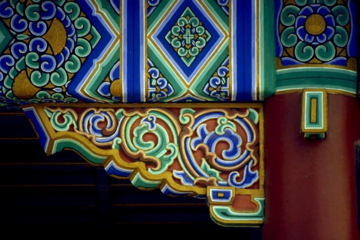 傳統(tǒng)彩畫是程式化的圖案,其設(shè)色有一定的規(guī)律。一般以明間為基點(diǎn)、上青下綠、青綠相間為原則。水平方向是:明間上青下綠,次間上綠下青,再次間又是上青下綠,以此類推。和璽彩畫、旋子彩畫和蘇式彩畫的設(shè)色規(guī)律基本相似,新式彩畫則沒有固定的設(shè)色規(guī)定。