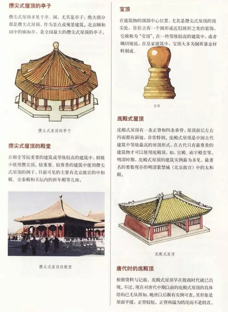 無正脊,只有垂脊,只應用于面積不大的樓、閣、亭、塔等,平面多為正多邊形及圓形,頂部有寶頂。根據(jù)脊數(shù)多少,分三角攢尖頂、四角攢尖頂、六角攢尖頂、八角攢尖頂。此外,還有圓角攢尖頂,也就是無垂脊。攢尖頂多作為景點或景觀建筑,如頤和園的郭如亭、麗江黑龍?zhí)豆珗@等。在殿堂等較重要的建筑或等級較高的建筑中,極少使用攢尖頂,而故宮的中和殿、交泰殿和天壇內的祈年殿等卻使用的是攢尖頂。攢尖頂有單檐、重檐之分。