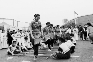 南京市第29中學(xué)初中部“2018校園民族文化節(jié)”上,學(xué)生們在跳竹竿舞。南京市第29中學(xué)初中部供圖