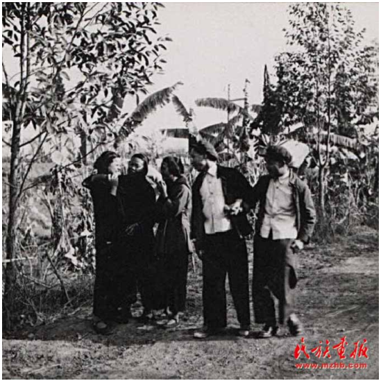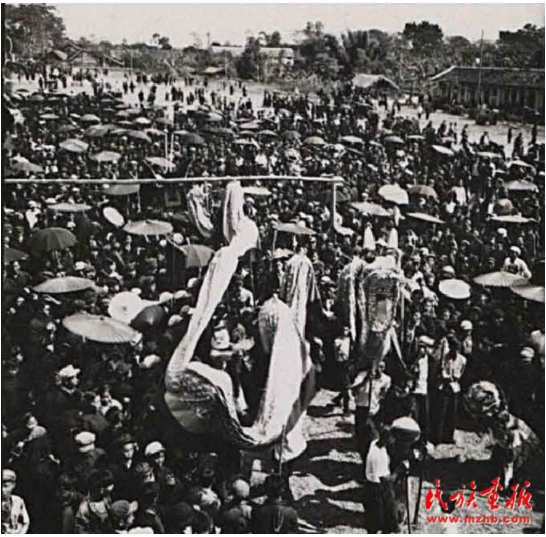 “歌圩”是桂西壯族古老的風(fēng)俗。每年農(nóng)歷正月、二月、四月都有歌圩日。圖為1957年廣西壯族自治區(qū)憑祥市郊區(qū)的歌圩日,這里不但處處歡歌笑語,還有搶花炮、演壯戲、舞彩龍、舞彩鳳、唱桂劇等很豐富的文娛活動(dòng)