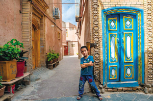 江庫(kù)爾干巷最美的門(mén),人們都愛(ài)在此留影。上午12點(diǎn),斑駁的陽(yáng)光灑在門(mén)上,瓦力小朋友跳到鏡頭前學(xué)著電影中的人物姿勢(shì),讓我給他拍照片。