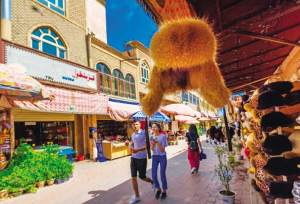 阿熱亞民俗文化街有多個(gè)巴扎,分別是首飾巴扎、花盆巴扎、坎土曼巴扎、木器巴扎、維藥巴扎、帽子巴扎。路上隨處可見(jiàn)妝扮時(shí)尚的當(dāng)?shù)厍嗄辏⒆觽兇┲贫淳欧峙W醒潯?/span>