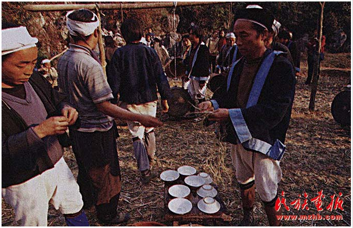打銅鼓有嚴(yán)格的規(guī)矩,銅鼓從主人家里拿出來(lái)以后,首先要舉行祭鼓的儀式。銅鼓根據(jù)葬禮主持人的安排,順序懸掛在木架上,木架搭多少要根據(jù)銅鼓的多少來(lái)確定。銅鼓數(shù)量的多少是根據(jù)葬禮主家家庭情況決定的,親戚朋友多的請(qǐng)的銅鼓就多,親戚朋友少的銅鼓來(lái)的就少。銅鼓懸掛的順序也是有規(guī)矩的,掛在開(kāi)頭和結(jié)尾的銅鼓必須是葬禮主家請(qǐng)來(lái)的,掛在第二的是主家舅舅的,然后按親朋好友的順序排列。