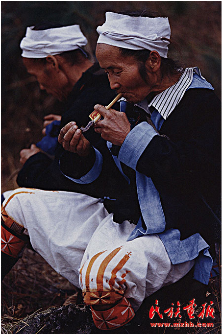 村里家家戶戶的門前,白褲瑤婦女不管是老年人還是青年人都在忙著紡線和畫著蠟畫。白褲瑤女子從小就跟著母親學(xué)紡線、織布、蠟畫、繡花。十二三歲就開(kāi)始給自己縫制嫁妝,結(jié)婚后又要給孩子和丈夫做衣服。