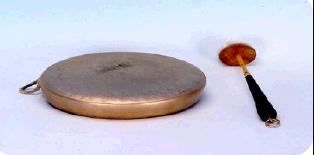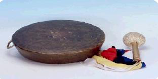 與小鑼相似但比小鑼要大,通常為面徑70CM,邊圈高10CM,邊穿小孔,用繩索固定。演奏時(shí),左手提繩,右手拿錘演奏;盤坐演奏時(shí)大鑼懸掛在木架上,可以用手來控制音色,其聲音洪亮、粗獷。